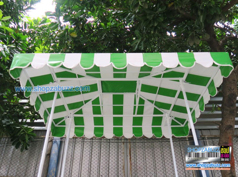 • หลังคาผ้าใบ สีเขียวสลับสีขาว ทรงสี่เหลี่ยม
